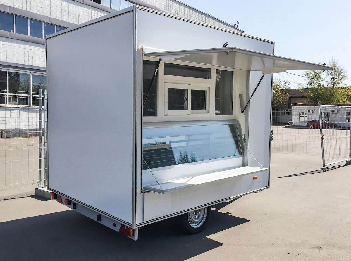 Прицеп длинной 2.5м, одно рабочее место. Грузоподъемностью до 100 кг. Предназначен для создания точек "быстрого питания", фаст-фуд. Автоприцеп торговый 813211-25 базовая комплектация Торговый прицеп Купава 813211-25 - малый одноосный прицеп Купава, предназначенный...